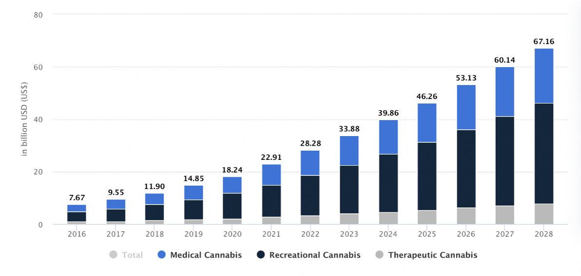 Industry Thesis: The Cannabis thesis centers around a rapid increase in legal demand as the sector moves towards eventual legalization translating into double-digit sales growth through 2030. US cannabis companies look quite inexpensive (single-digit EBITDA multiples) relative to CPG/Alcohol (double-digit EBITDA multiples) and even tobacco companies despite potential growth far in excess of their peers. Today, there is an opportunity to invest in a sector which is under-owned/analyzed, has a clear catalyst with legalization and is likely already a ~$100B industry (only ~$30B legal). The biggest competitor to my two main picks GTI & GLASF is in fact illegal sellers of cannabis which are estimated at around 70% or more of the total market. The below is a good estimate of the market which I believe to be in the right zip code.